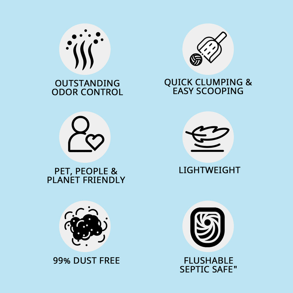 FEELING BEST Tofu Cat Litter is made from plant-based ingredients (pea husk, corn starch, and guar gum). It forms tight clumps quickly for easy scooping, is low-dust, and can be flushed in small portions (follow local plumbing rules).