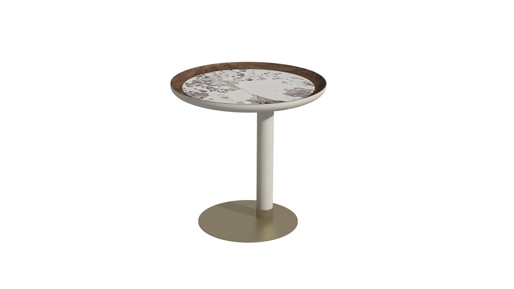 A tall round side table featuring a Snow Mountain Blue luxury marble top, upholstered in microfiber leather with solid North American walnut accents. Finished with champagne-brushed 304 stainless steel details, it offers both elegance and durability, serving as a refined accent for sofas or lounge chairs. Dimensions: φ500 × 550 mm.