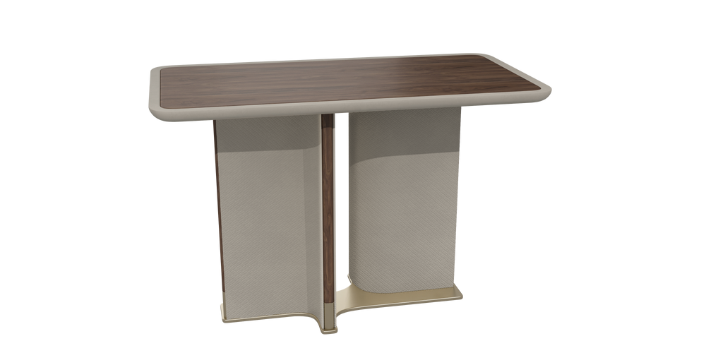 A refined long side table crafted with a solid North American walnut frame, upholstered in microfiber leather for a soft, elegant touch. Accented with champagne-brushed 304 stainless steel details, with a leather-textured lacquer finish on the base panel and tabletop edging. Compact yet versatile, it adds both function and style to modern living spaces. Dimensions: 750 × 400 × 500 mm.